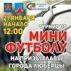 20 января 2017Турнир по мини-футболу пройдет в Люберцах на стадионе «Торпедо» в субботуТрадиционный турнир по мини-футболу на призы главы города Люберцы пройдет в субботу на запасном поле стадиона «Торпедо», сообщил «РИАМО в Люберцах» председатель комитета по физической культуре, спорту и туризму администрации района Владимир Сурков.