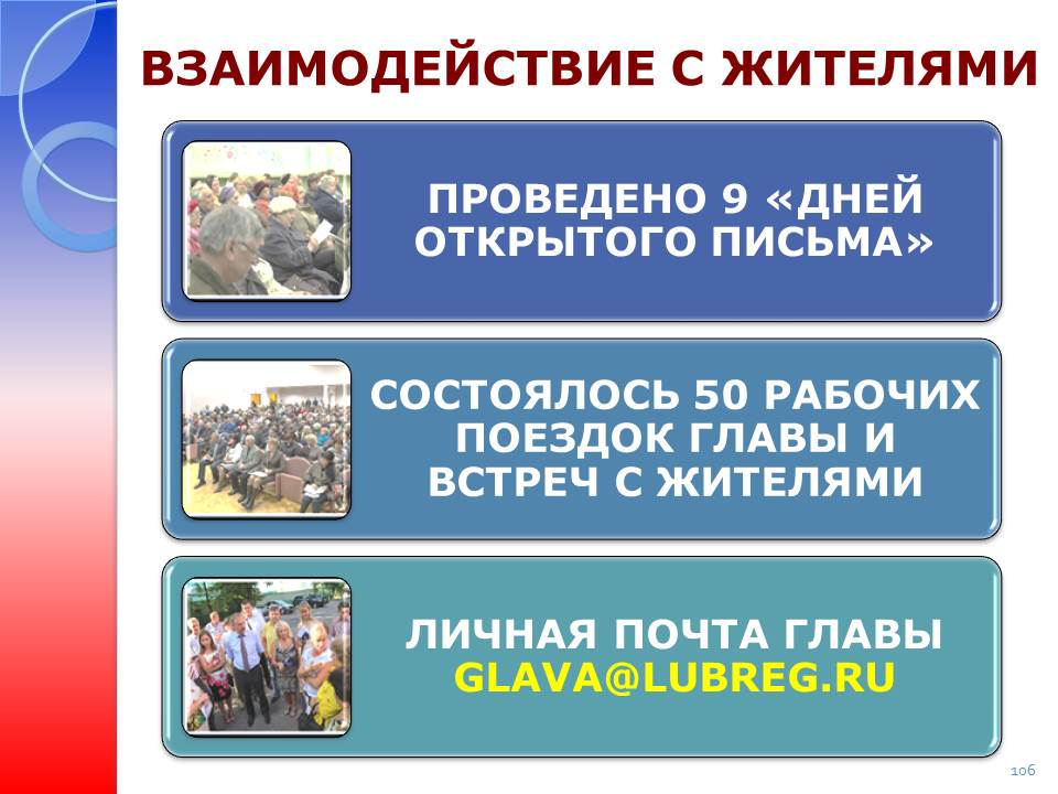 В своей повседневной работе мы руководствуемся базовым принципом, провозглашенным А.Ю. Воробьевым, – Житель всегда прав! Только налаженная двусторонняя связь с жителями, открытый и прямой диалог могут обеспечить по настоящему качественное, отвечающее интересам жителей, развитие территории. С этой целью в прошлом году мы провели в микрорайонах города 9 «Дней открытого письма» и более 50 рабочих встреч, где было поднято более 500 вопросов, волнующих наших жителей. Для оперативной связи круглосуточно работает мой личный электронный почтовый ящик: glava@lubreg.ru, все обращения на который оперативно рассматриваются.