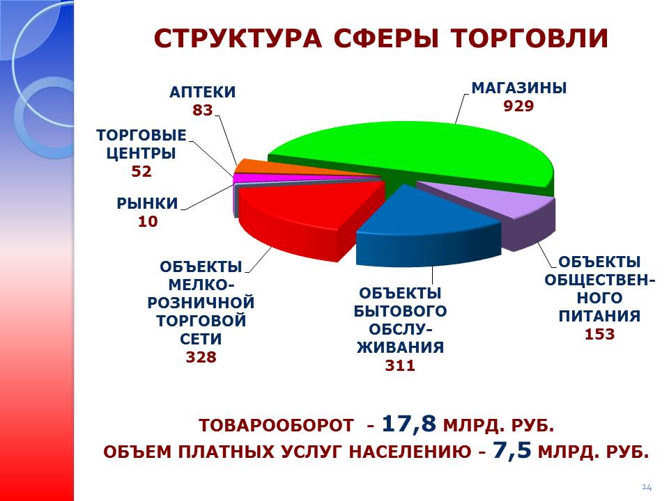 Оборот розничной торговли в районе за истекший 2014 год составил 17,8 млрд. рублей с ростом на 23,4% к прошлому году, объем платных услуг населению 7,5 млрд. руб.