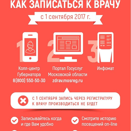 Информируем Вас, что c 1 сентября 2017 года в учреждениях здравоохранения Московской области будет прекращена запись на плановый прием к врачу через регистратуру.