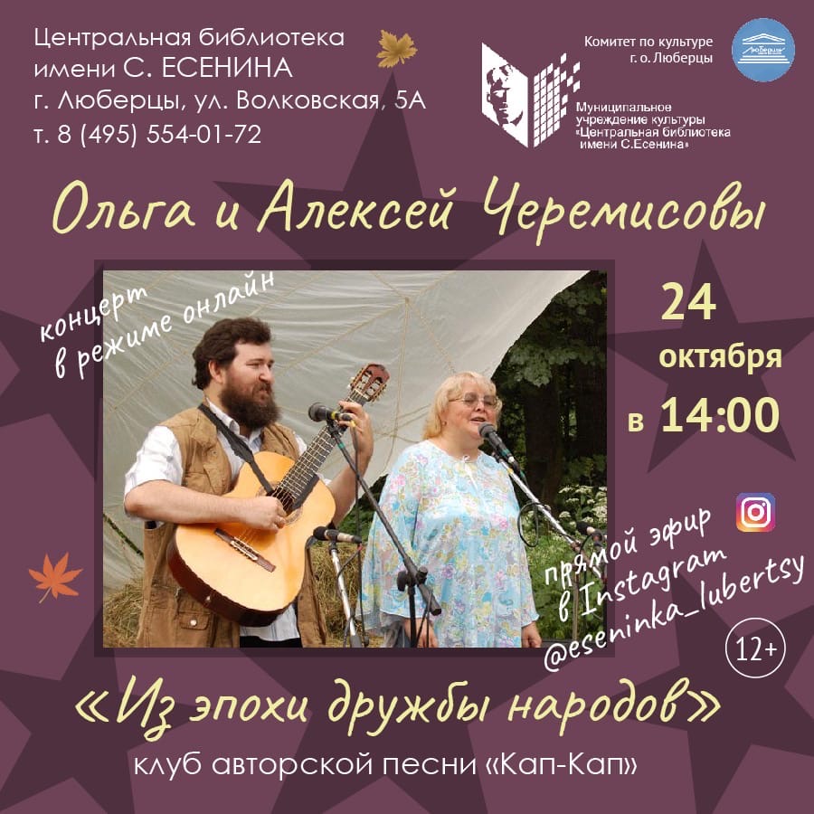 Центральная библиотека им. С. Есенина приглашает люберчан на онлайн-концерт «Из эпохи дружбы народов», который состоится в субботу, 24 октября.