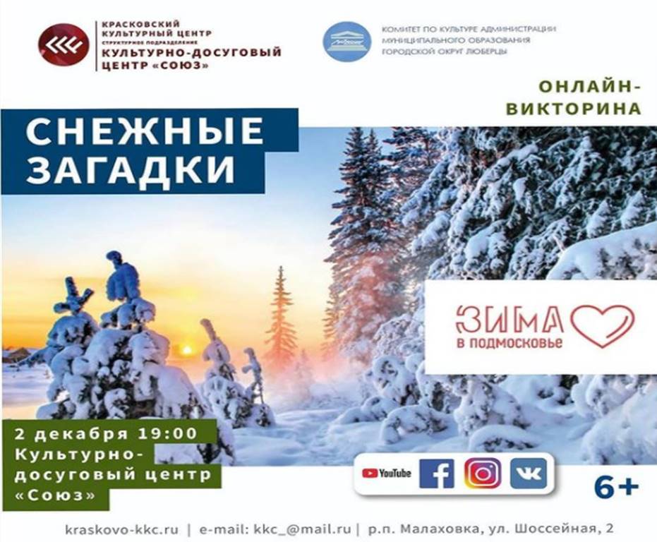 В среду, 2 декабря, КДЦ «Союз» приглашает юных люберчан на онлайн-викторину «Снежные загадки».