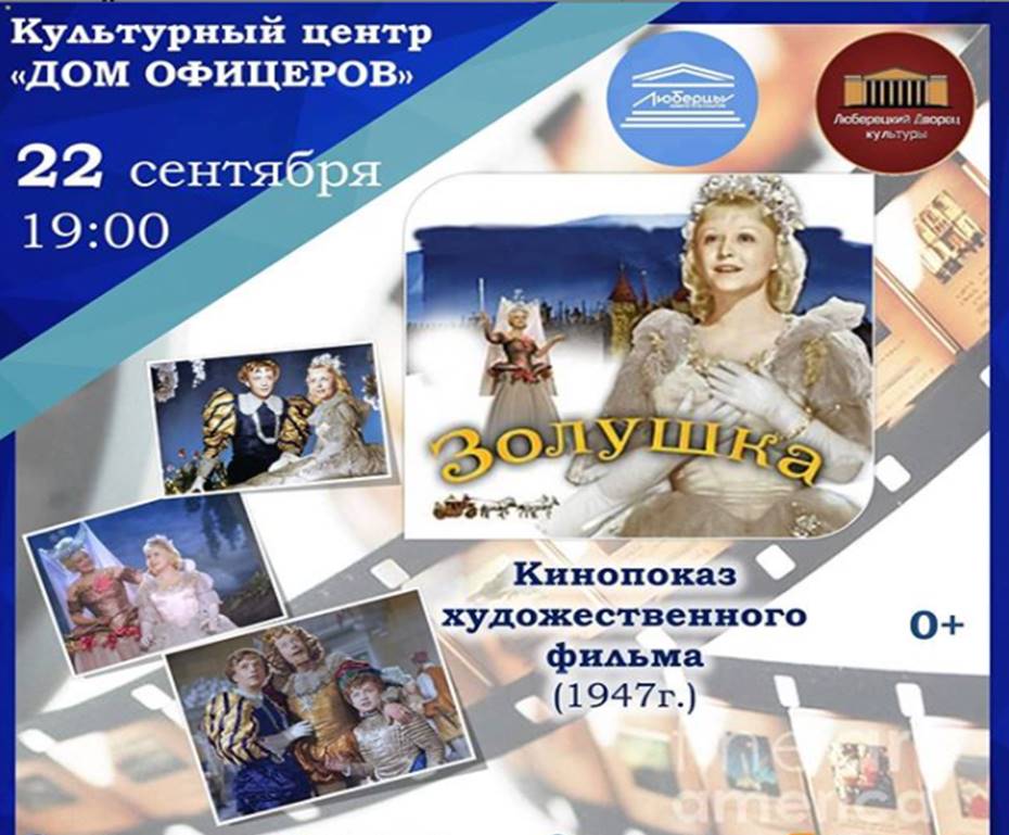Во вторник, 22 сентября, культурный центр «Дом офицеров» приглашает люберчан на показ фильма-сказки «Золушка». Начало в 19:00.