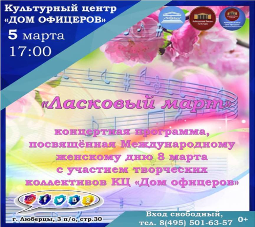 В пятницу, 5 марта, культурный центр «Дом офицеров» приглашает люберчан на концертную программу «Ласковый март», посвященную Международному женскому дню.