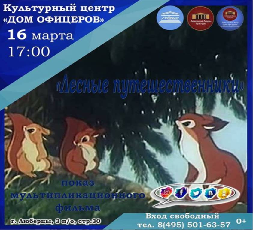 Во вторник, 16 марта, культурный центр «Дом офицеров» приглашает юных люберчан на показ мультипликационного фильма «Лесные путешественники». Начало в 17:00.