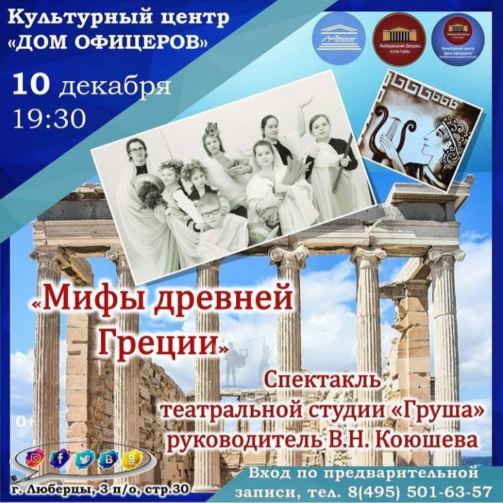 В четверг, 10 декабря, культурный центр «Дом офицеров» приглашает люберчан на спектакль «Мифы Древней Греции», который подготовили участники театральной студии «Груша».