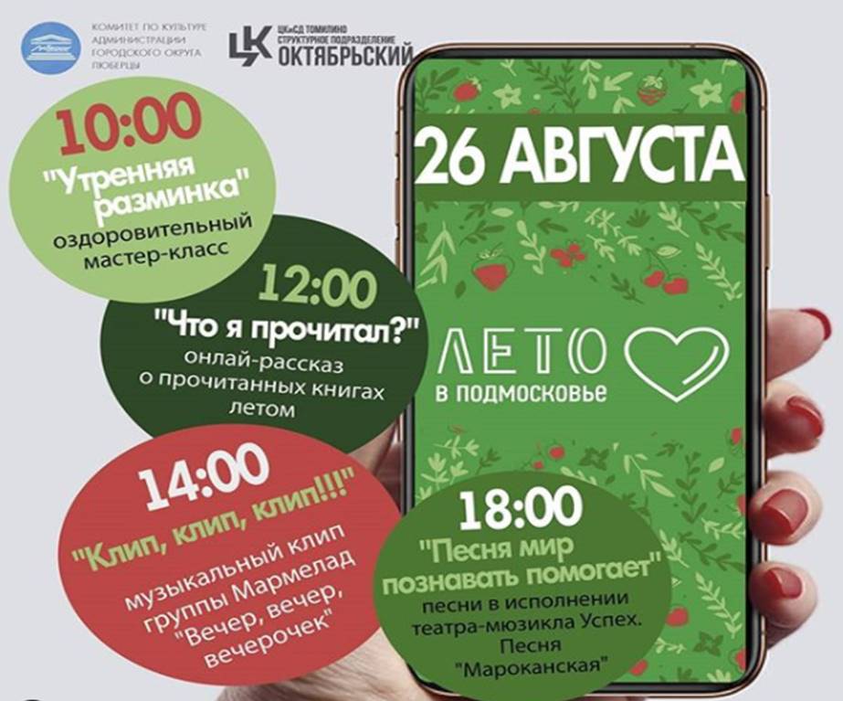В среду, 26 августа, культурный центр Октябрьский приглашает люберчан на онлайн-мероприятия: