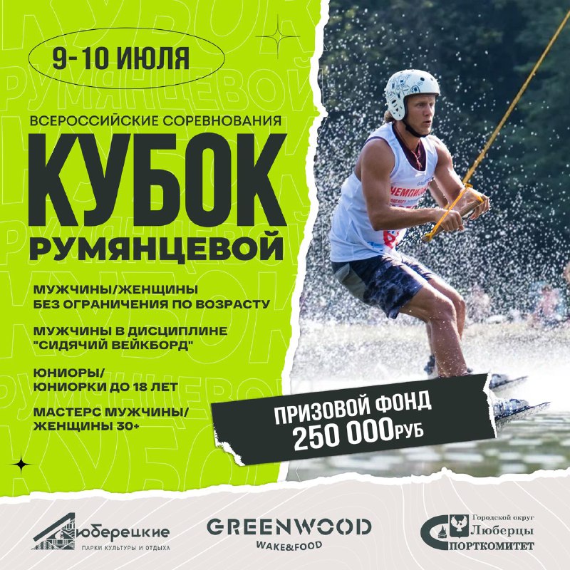 «С 9 по 10 июля в парке «Наташинские пруды» городского округа Люберцы состоятся Всероссийские соревнования «Кубок Румянцевой» по вейкбордингу. Турнир пройдет по четырем дисциплинам: мужчины/женщины без ограничений по возрасту; мужчины в дисциплине «сидячий вейкборд»; юниоры/юниорки до 18 лет и «мастерс» - мужчины/женщины 30+», - отметил Ружицкий.