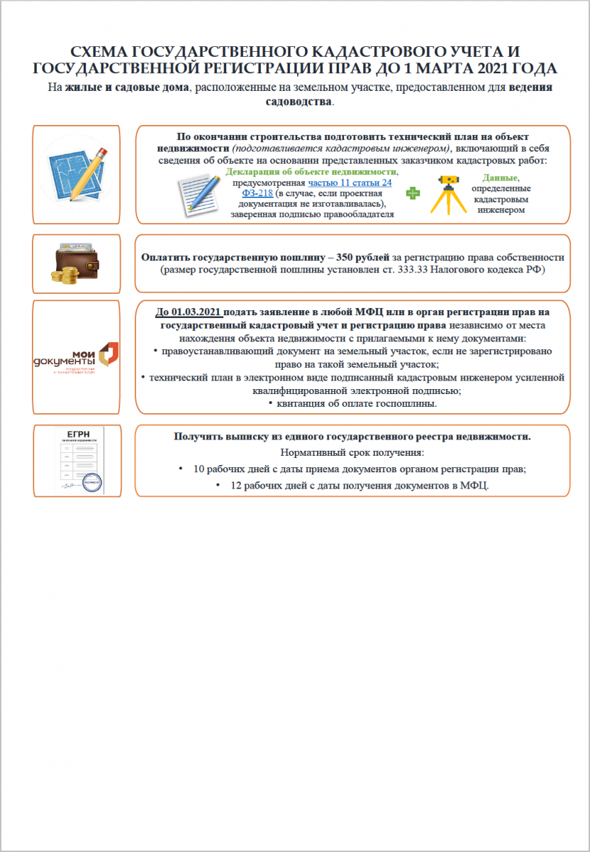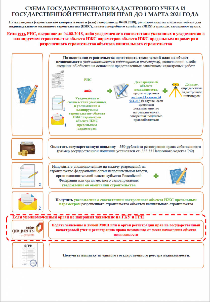 Важно! Законом предусмотрена возможность до 1 марта 2021 года регистрации уже построенных домов и домов, строительство которых начато до 4 августа 2018 года без разрешительных документов, в том числе на земельных участках, предназначенных для ведения индивидуального жилищного строительства (ИЖС) и личного подсобного хозяйства (ЛПХ) в границах населенных пунктов.