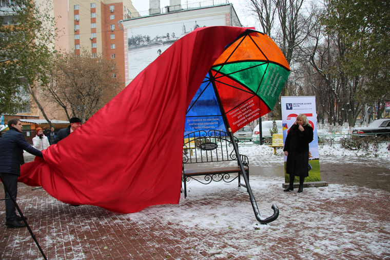 «В честь своего 25-летия банк «Возрождение» сделал подарок городу - установил в центре Люберец «Беседку счастья». Я думаю, она станет одним из любимых мест отдыха горожан. Здесь можно назначать свидания и просто фотографироваться, а те, кто посидит в беседке, обязательно будет счастлив», - рассказал глава.