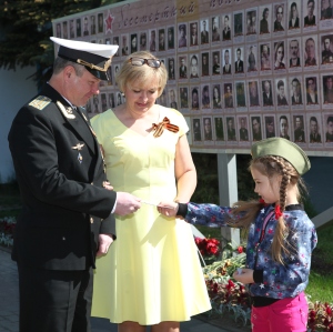 В каждом треугольнике – рисунки малышей и их трогательное напоминание взрослым и детям, что своим счастьем жить мы обязаны людям старшего поколения: участникам боевых сражений и труженикам тыла.