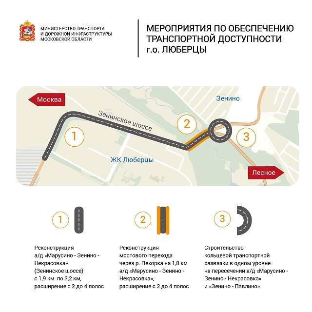 Для улучшения транспортной ситуации в городском округе Люберцы будет проведена реконструкция автодороги «Марусино-Зенино-Некрасовка» (Зенинское шоссе) на участке с 1,9 по 3,2 км и реконструкция мостового перехода через р. Пехорка, а также выполнено строительство одноуровневой транспортной развязки на пересечении автодорог «Марусино-Зенино-Некрасовка» и «Зенино-Павлино». Объекты включены в госпрограмму Московской области «Развитие и функционирование дорожно-транспортного комплекса» с началом строительно-монтажных работ в 2018 году.