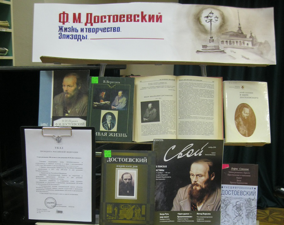 С 25 по 29 ноября в читальном зале библиотеки им. С. Есенина оформлена книжная выставка-размышление: "Ф.М. Достоевский. Жизнь и творчество. Эпизоды".