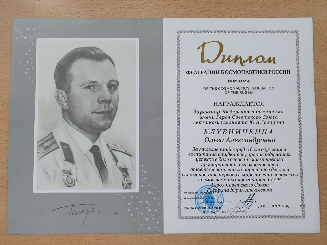 Директор Люберецкого техникума имени Гагарина за многолетний труд и пропаганду успехов в деле освоения космоса Ольга Клубничкина награждена дипломом Федерации космонавтики России.