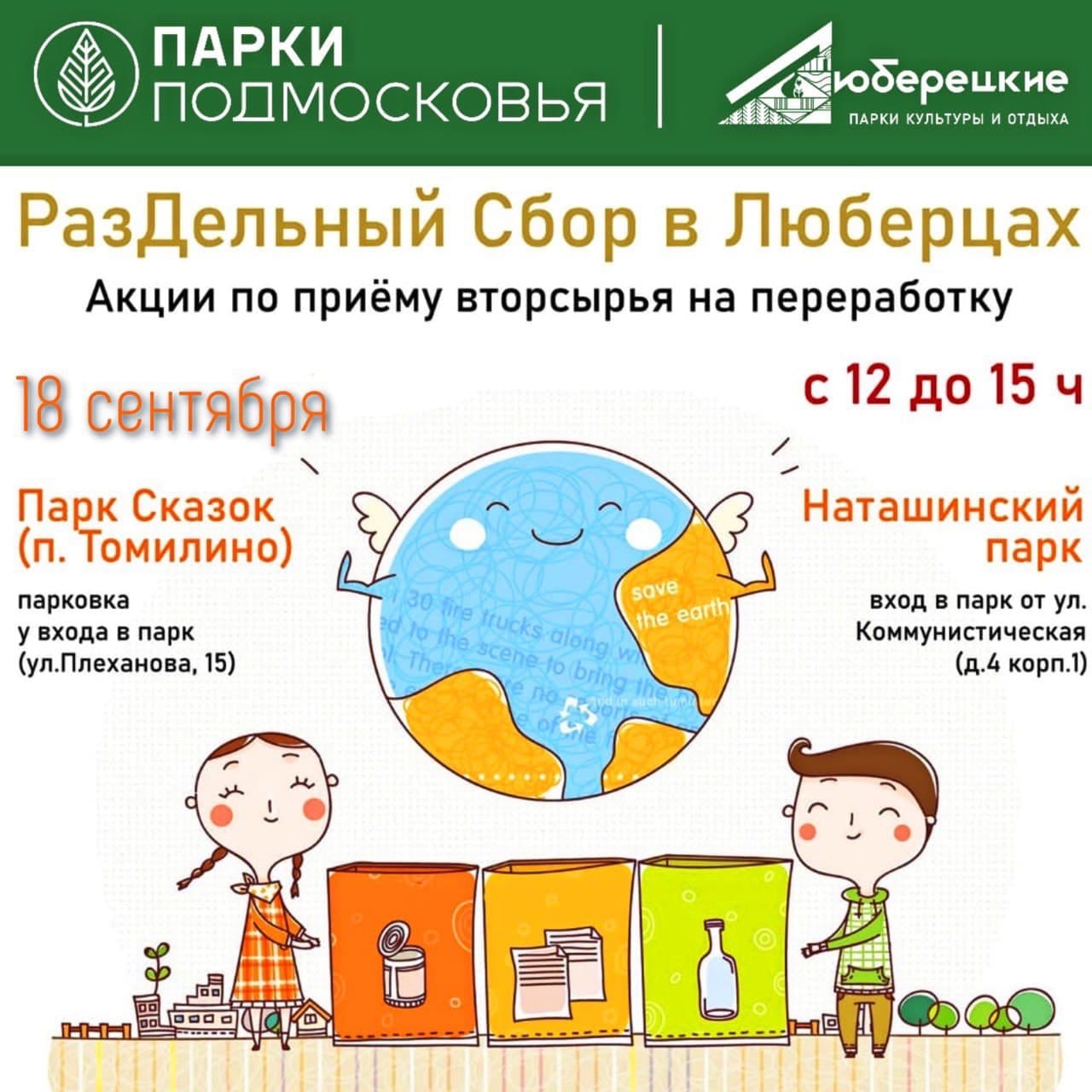 Пункты приема будут работать в «Парке Сказок» - на парковке у входа в парк (пос. Томилино, ул. Плеханова, д. 15) и парке «Наташинские пруды» - возле входа в парк с ул. Коммунистическая, д. 4 корп. 1.