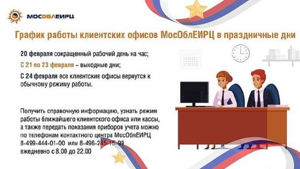 Клиентские офисы МосОблЕИРЦ с 20 по 23 февраля, в связи с предстоящим праздником День защитника Отечества, перешли на измененный график работы, сообщили в расчетном центре.