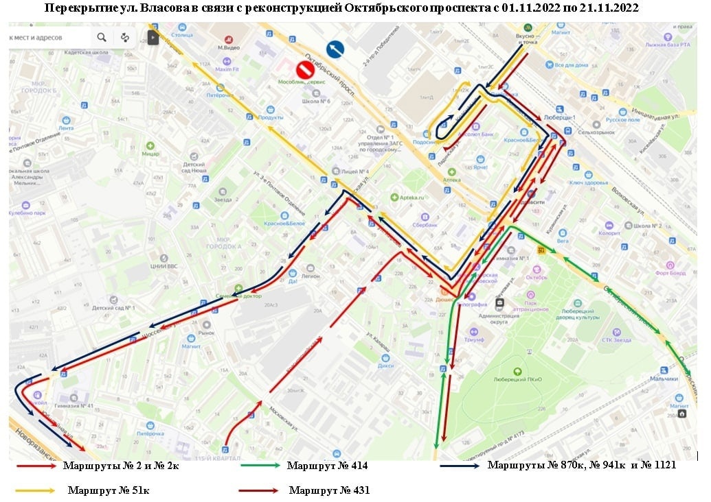 В связи с этим с 1 по 21 ноября маршруты общественного транспорта №2, №2к, №414, №431, № 51к, №870к, №941 и №1121 не будут заезжать на улицу Власова, остановочный пункт «Поликлиника».