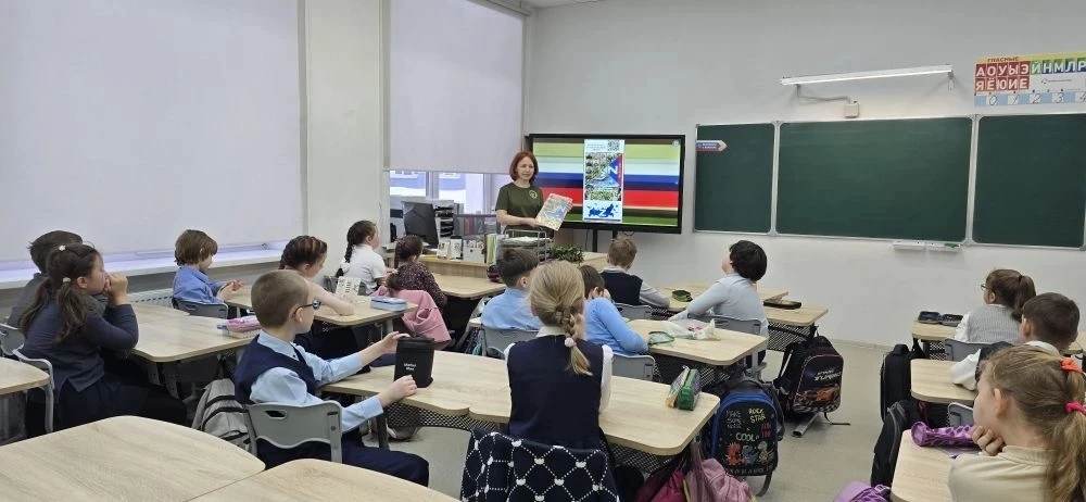 В гимназии № 1 городского округа Люберцы прошёл Урок мужества «Россия — Родина моя». Встречу для школьников провела сотрудник управления по работе с ветеранами СВО, руководитель штаба Комитета семей воинов Отечества округа, супруга участника СВО Наталья Лежнева.