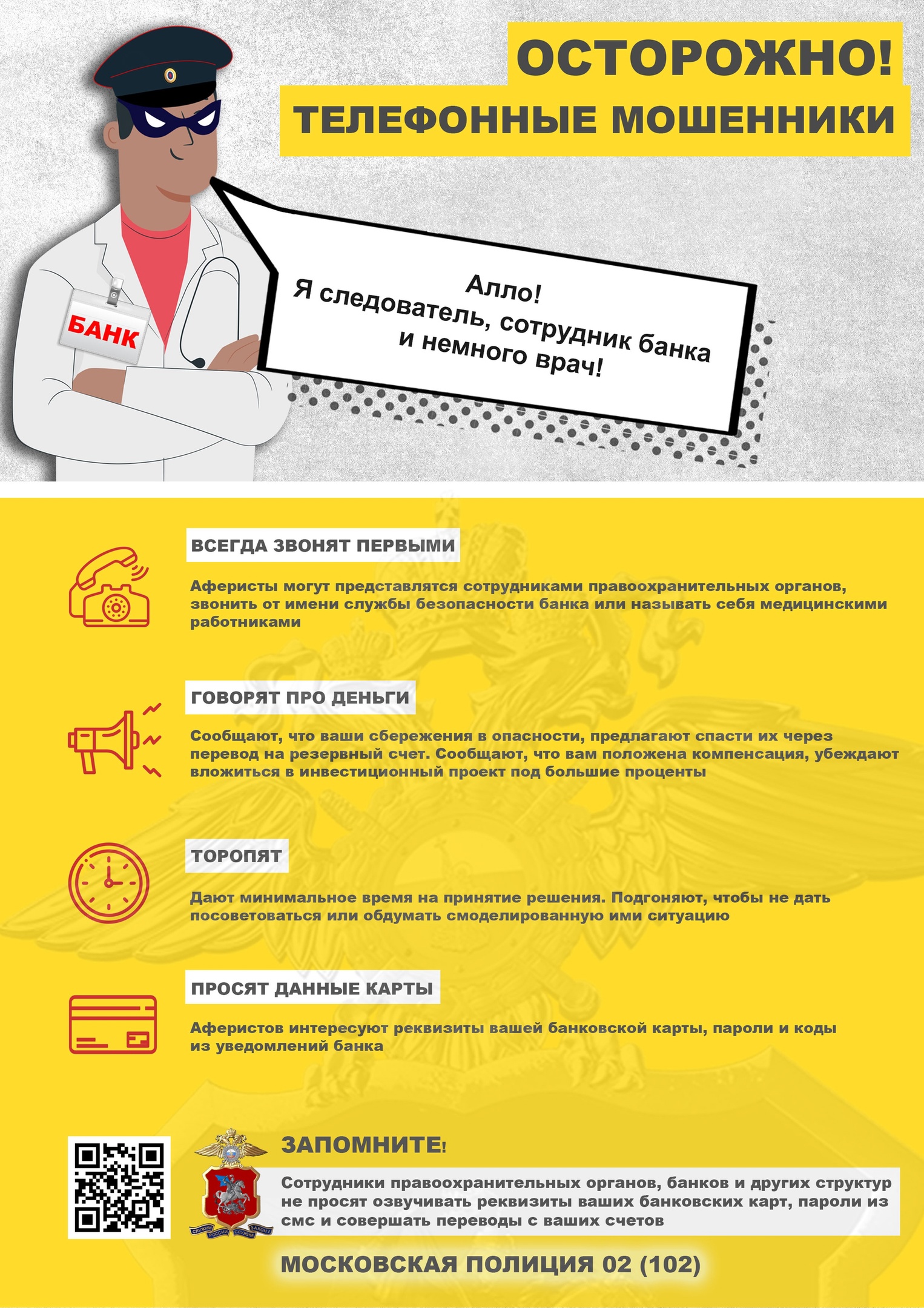 Полиция городского округа Люберцы обращает внимание на то, что сотрудники банков и полиции никогда не спрашивают реквизиты карты, пароли, коды, персональные данные, не просят совершать переводы по карте. Поэтому никому не стоит сообщать конфиденциальную информацию: коды из СМС, трёхзначный код на обороте карты, пароли или логины от личных кабинетов, кодовые слова, персональные данные.