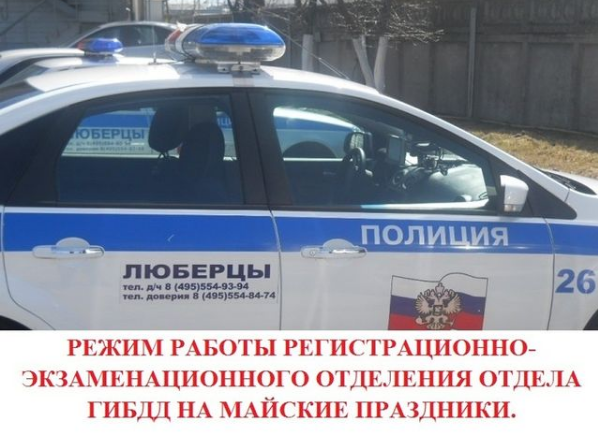 «Уважаемые участники дорожного движения! В майские праздники отделом ГИБДД МУ МВД России «Люберецкое» будет осуществляться дополнительный прием граждан по вопросам регистрации транспортных средств, приему экзаменов и выдаче водительских удостоверений в соответствии с установленным графиком. 4, 5, 6, 7, 8 мая - приемные дни с 09.00 до 18.00 (перерыв с 13.00 до 14.00). 1, 2, 3, 10 мая - нерабочие дни», - отмечается в сообщении.