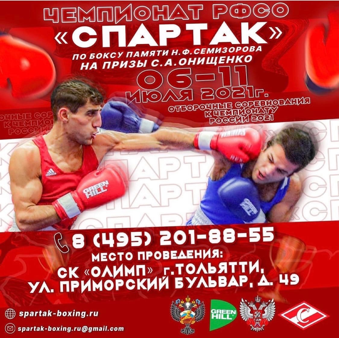 В Тольятти с 6 по 11 июля пройдет Чемпионат РФСО «Спартак» по боксу среди мужчин и женщин памяти Н. Ф. Семизорова на призы С. А. Онищенко В соревнованиях примут участие боксеры в 10 весовых категориях из различных субъектов Российской̆ Федерации.