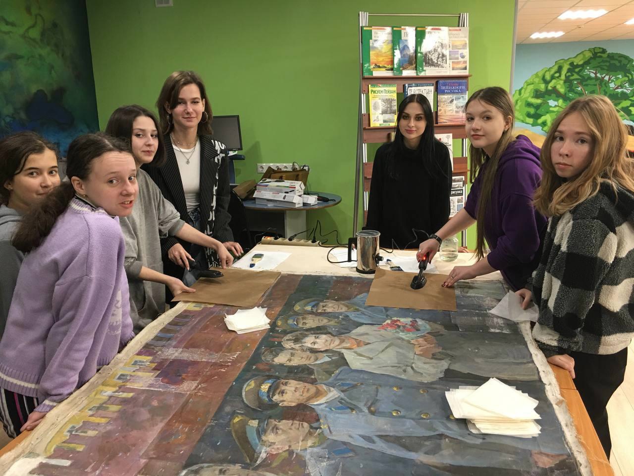 «Работу над полотном «Космонавты на Красной площади» размером 120×175 см студенты начали в конце прошлого года. Перед началом реставрации была проведена экспертиза, в ходе которой выявили повреждения: утраты красочного слоя и грунта, прорывы холста, заломы и трещины. Для укрепления красочного слоя использовали микалентную бумагу и кроликовый клей. На втором этапе изготовили рабочий подрамник для разглаживания основы произведения масляной живописи. Затем была выполнена процедура снятия микалентной бумаги», — рассказала преподаватель специальных дисциплин по направлению «Графический дизайнер» Татьяна Чадаева.