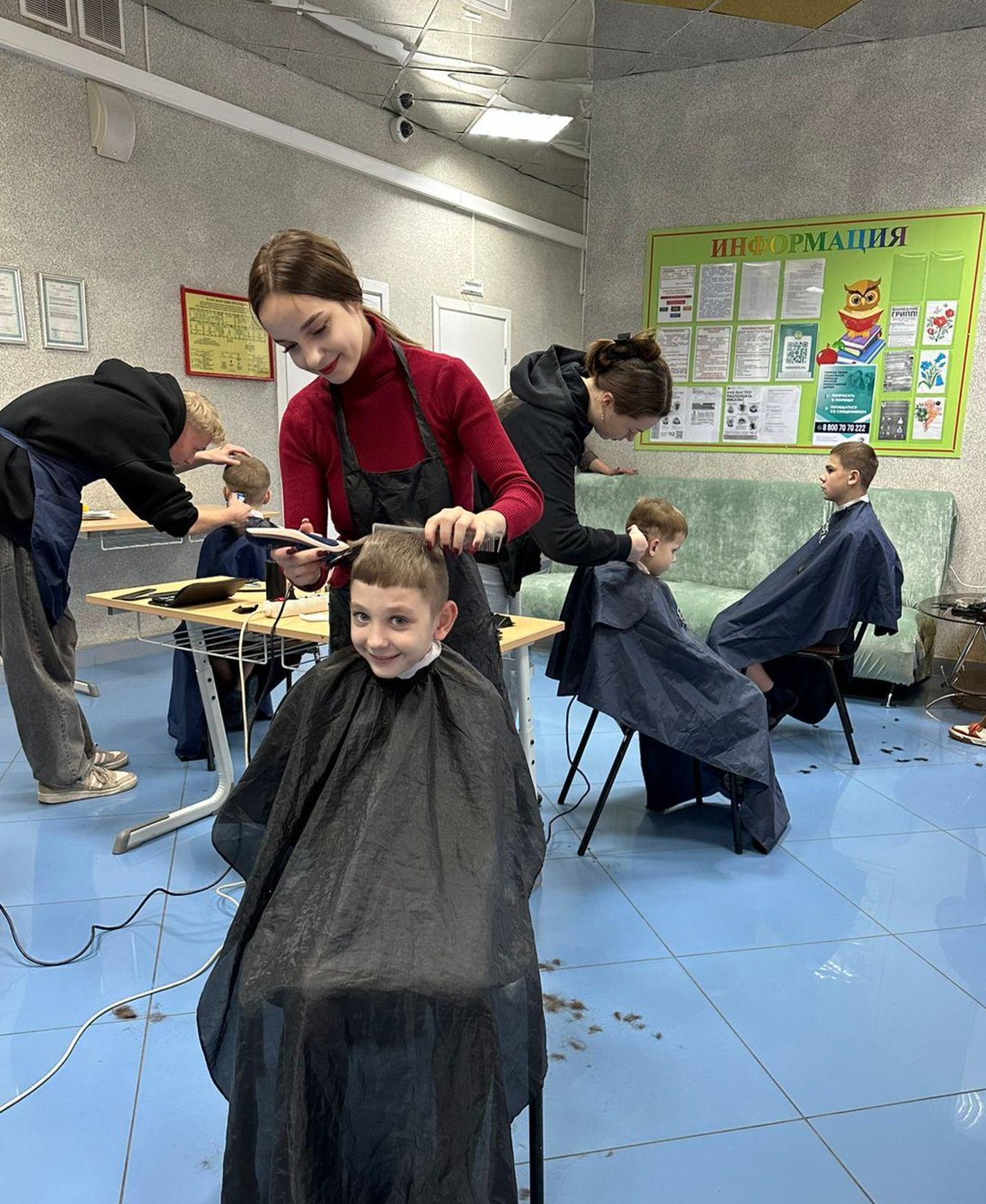 Ребята в предвкушении ждали своей очереди, а студенты-мастера старались сделать каждую стрижку особенной. Не только работа с ножницами, машинками и расческами имела значение в этом визите. Важно было просто познакомиться и пообщаться с ребятами, оказать им поддержку.
