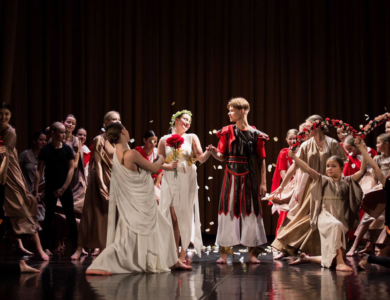 Танцевальный спектакль оснащён яркими костюмами, декорациями, сценическим светом и тематической музыкой.