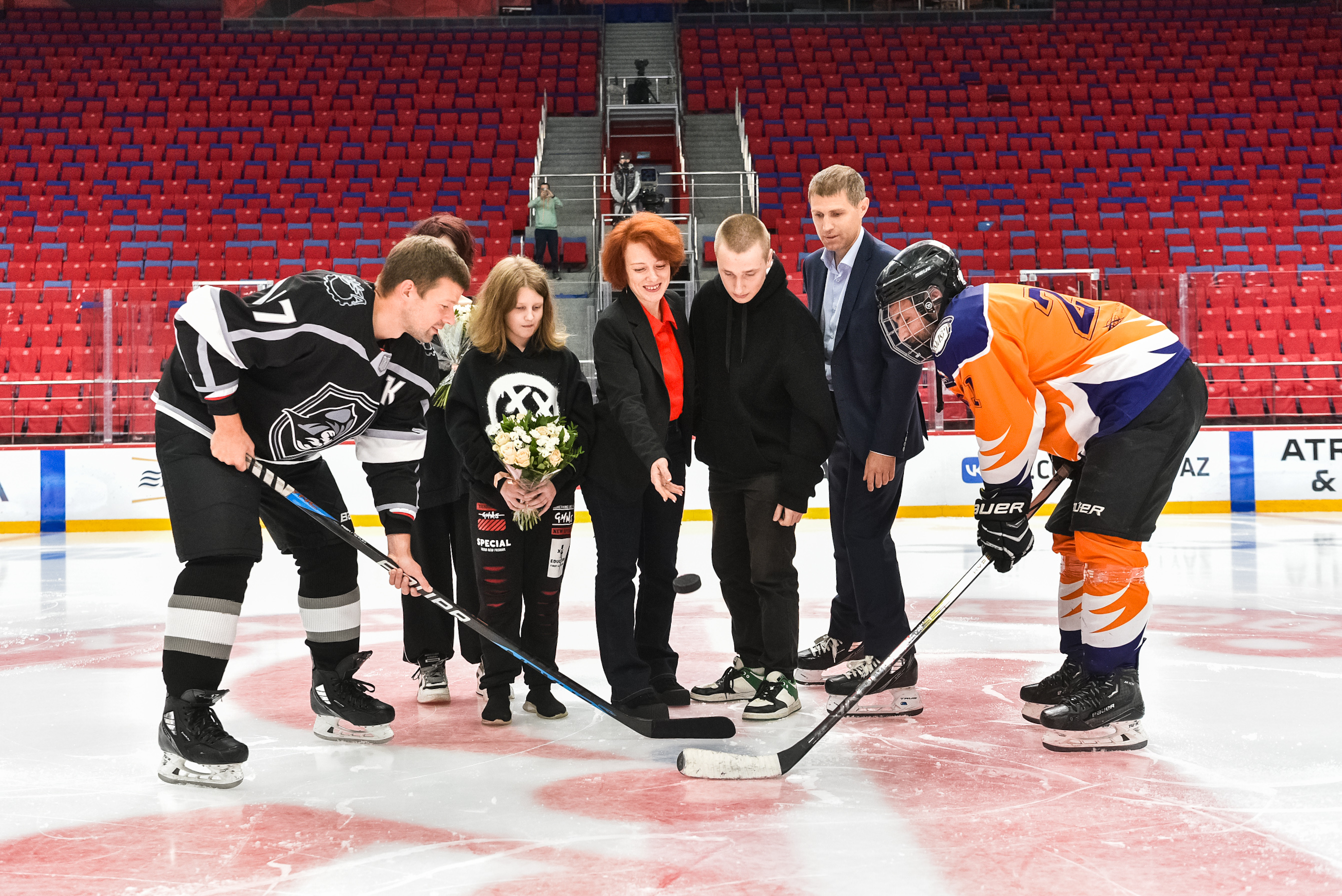 В символическом вбрасывании шайбы приняли участие капитаны команд, заместитель главы городского округа Люберцы Андрей Сыров, родные Олега – его жена Галина, сын и две дочери.