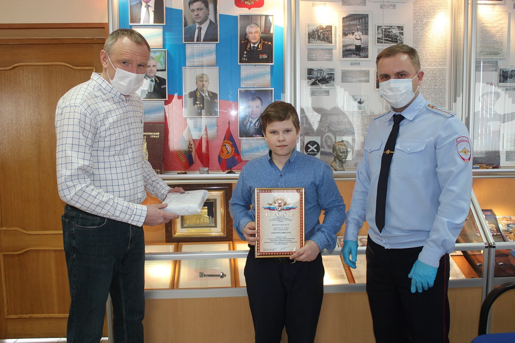 Сотрудники ОГИБДД МУ МВД России «Люберецкое» совместно с заместителем председателя Общественного совета при МУ МВД Сергеем Черкашиным наградили победителя регионального этапа конкурса детских рисунков «Мои родители работают в полиции» - 12-летнего Николая Сидорова.