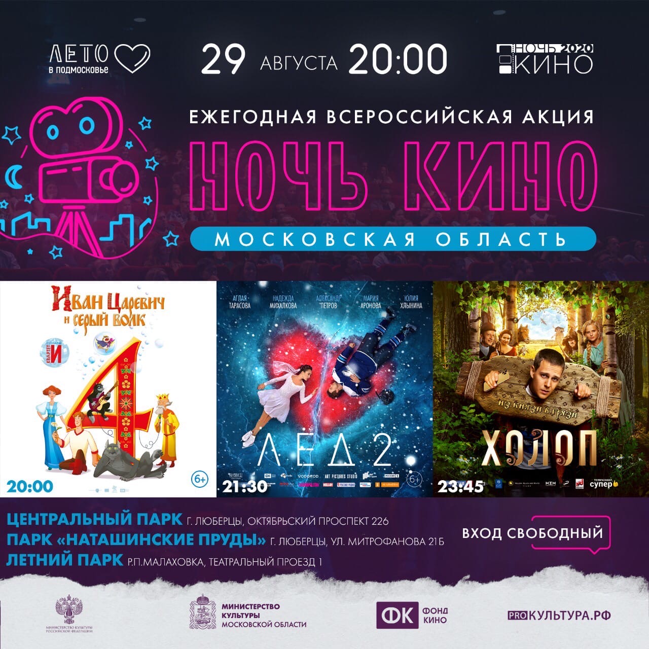 В рамках акции люберчане увидят следующие фильмы: мультфильм «Иван Царевич и Серый волк 4» (начало 20:00), мелодраму «Лед 2» (начало в 21:30), комедию «Холоп» (начало в 23:45).