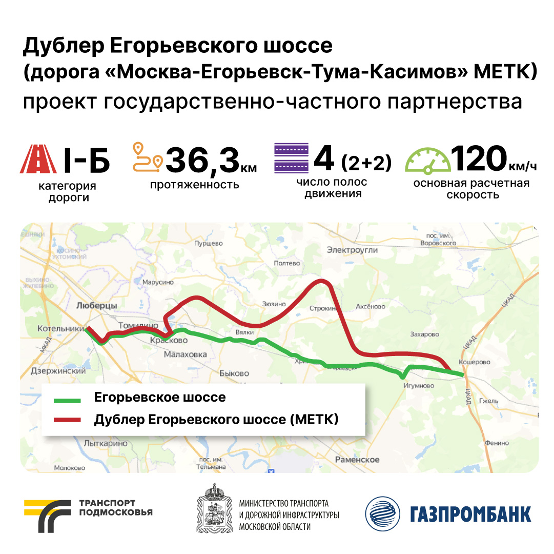 «Это важный и масштабный проект, который будет являться альтернативой бесплатного участка Егорьевского шоссе. Дублер шоссе планируется сделать платным с двумя полосами движения в каждую сторону. Дорога будет начинаться от Люберец, пройдет севернее Егорьевского шоссе и выйдет к ЦКАД. Дорога позволит разгрузить и вывести транзитный поток за пределы улично-дорожной сети Раменского и Люберец, что сделает движение по Егорьевскому шоссе безопаснее, а также улучшит транспортную доступность восточного участка ЦКАД. Новым дублёром смогут воспользоваться более 2 млн жителей Подмосковья», – сказал министр транспорта и дорожной инфраструктуры Московской области Алексей Гержик.