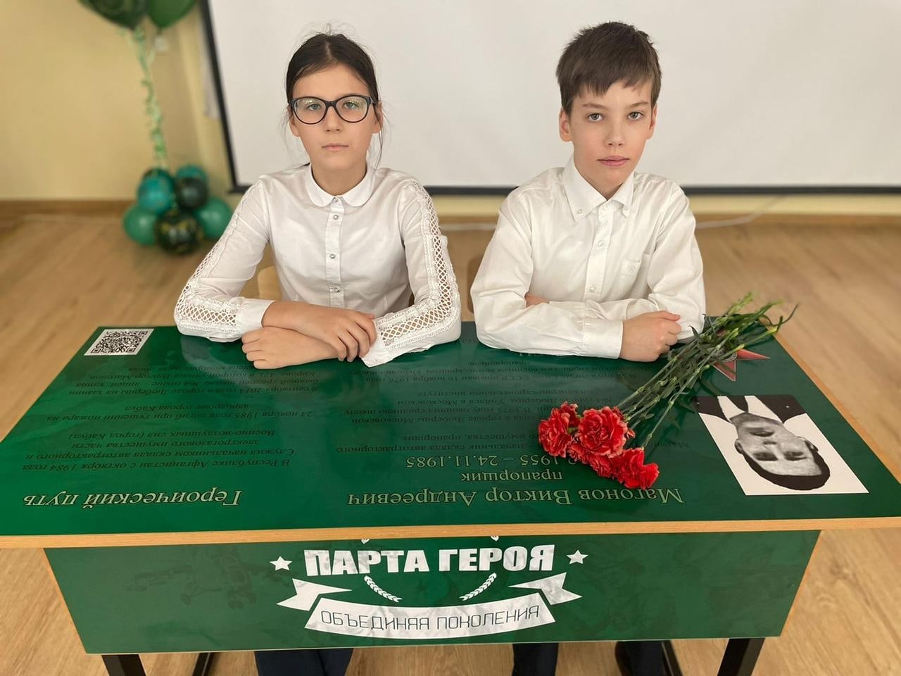 Парта Героя – ученическая парта с размещенной на ней информацией о заслуженном человеке, герое, имеющем непосредственное отношение к школе и вошедшем в историю Отечества и являющимся героем нашего времени, его фотографией, биографией, героическим путем. На парте размещается QR-код для мобильных устройств, отсканировав который школьник попадет на официальный портал, где представлена информация о герое.