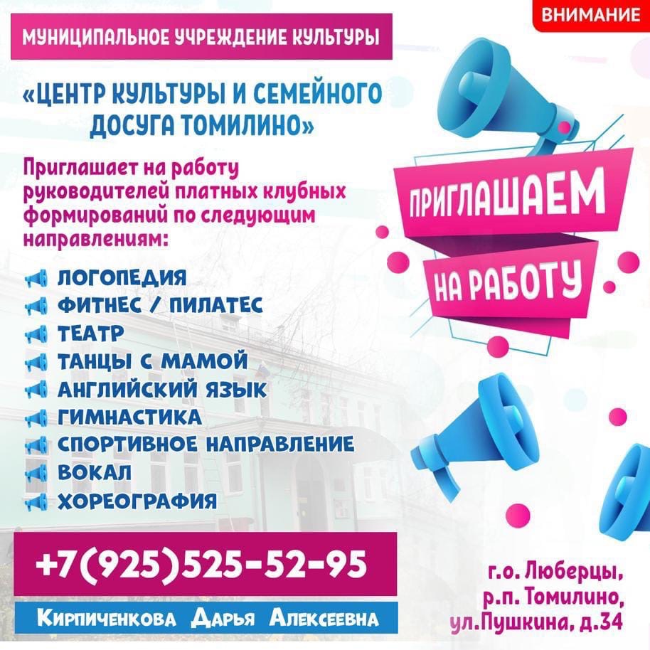 «Центр культуры и семейного досуга Томилино» приглашает на работу творческих, креативных и ответственных руководителей клубных формирований по следующим направлениям: хореография, вокал, фитнес/пилатес, журналистика, гимнастика и многое другое. Мы приглашаем Вас стать частью нашего дружного коллектива», - отмечается в сообщении.