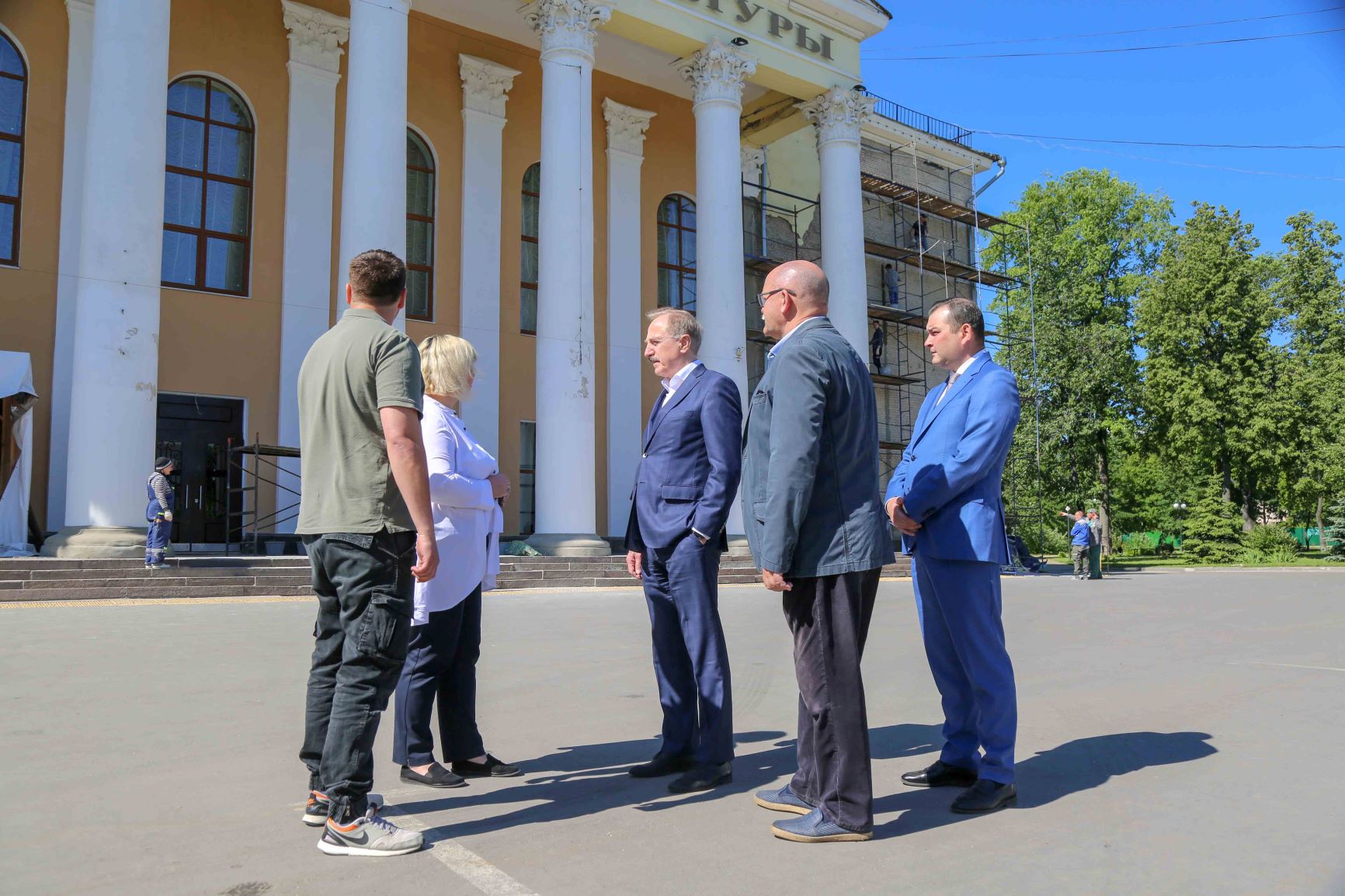 Глава добавил, что в настоящий момент производится окраска фасада Дома культуры, ремонт штукатурки наружных откосов, наружных столбов и прямоугольных колонн, окраска оконных и дверных откосов, ремонт лепных капителей колонн, смена водосточных труб.