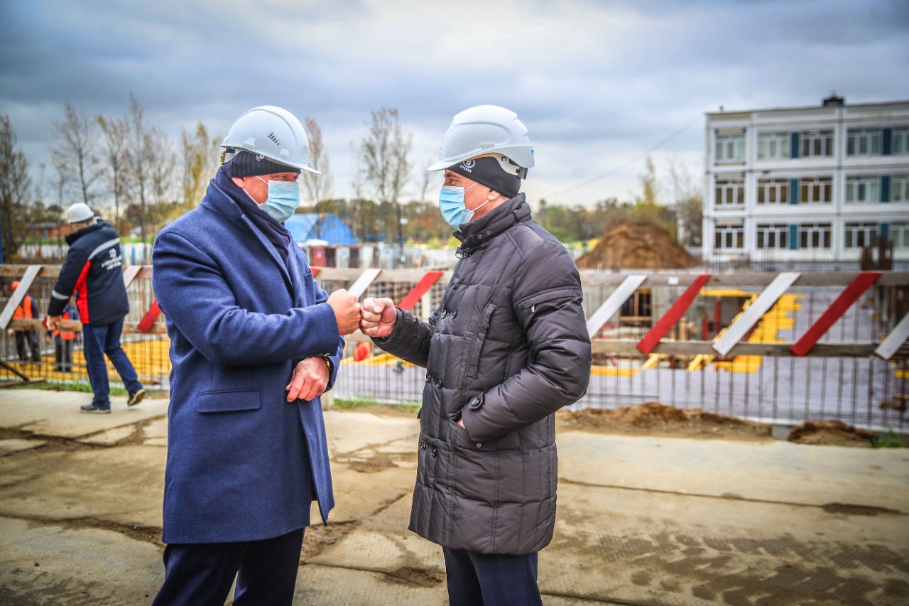 В деревне Марусино Люберец продолжается строительство пристройки на 400 мест к школе №59, во вторник глава городского округа Владимир Ружицкий вместе с руководителем ООО «Строительный Холдинг Тезис» Игорем Шаховым провёл выездное совещание на площадке.