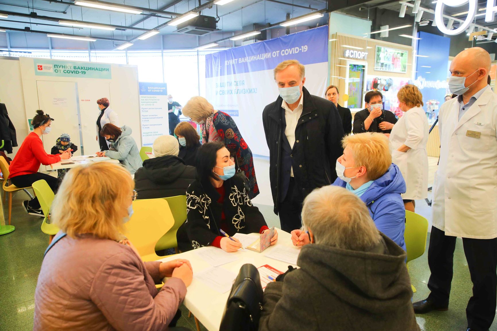 В среду, 28 апреля, глава городского округа Люберцы Владимир Ружицкий проинспектировал работу стационарного пункта вакцинации от COVID-19 в торговом центре «Светофор» в Люберцах.