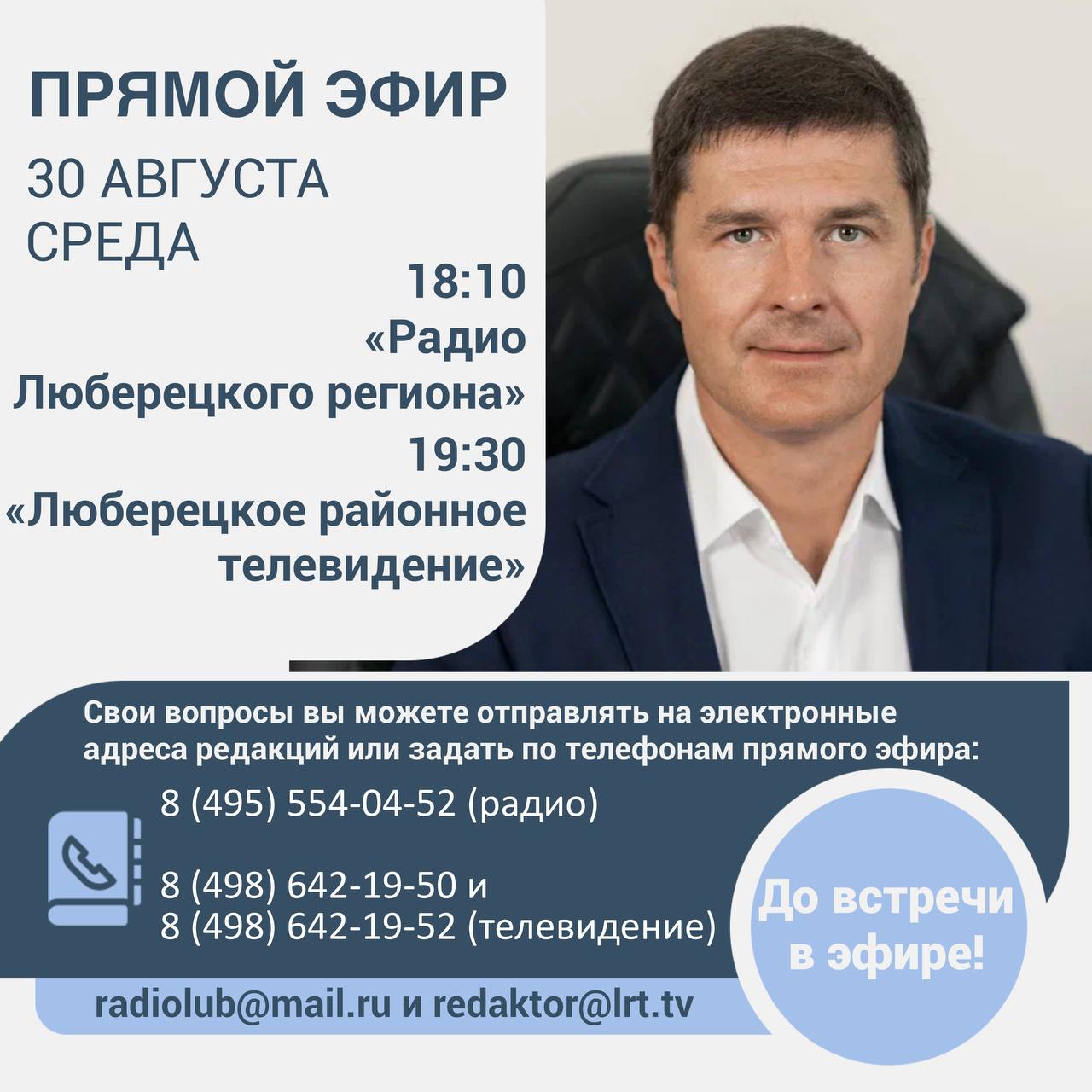 Он пояснил, что свои вопросы жители могут отправлять на электронные адреса редакций: radiolub@mail.ru и redaktor@lrt.tv или задать по телефонам прямого эфира: 8 (495) 554-04-52 (радио) и 8 (498) 642-19-50 и 8 (498) 642-19-52 (телевидение).
