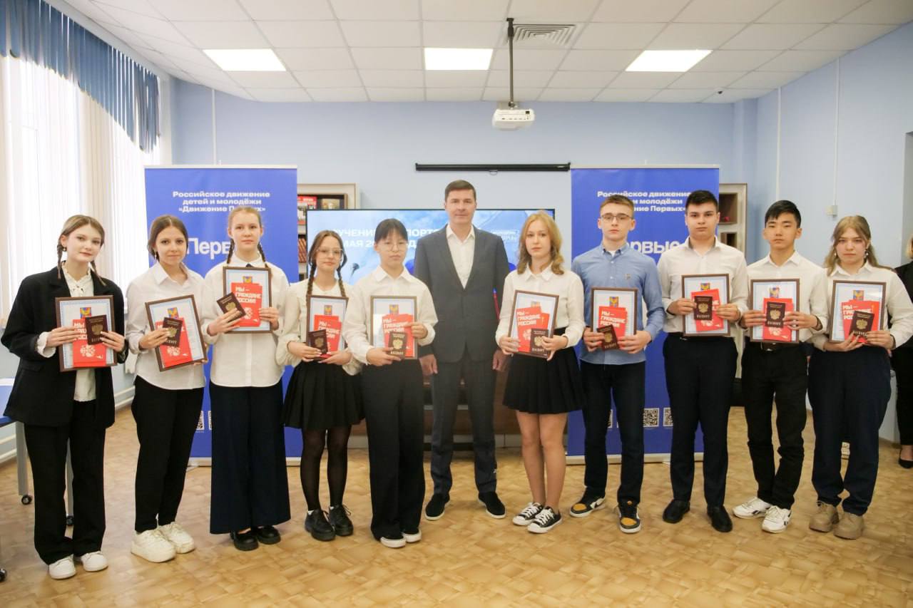 Он поздравляю ребят с получением паспортов.