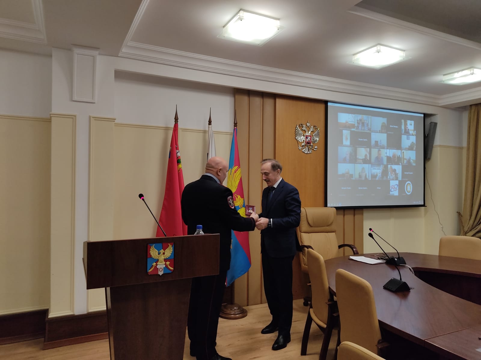 Начальник МУ МВД России «Люберецкое» Евгений Романцев на оперативном совещании в администрации муниципалитета в понедельник вручил главе городского округа Люберцы Владимиру Ружицкому нагрудный знак «За содействие МВД».