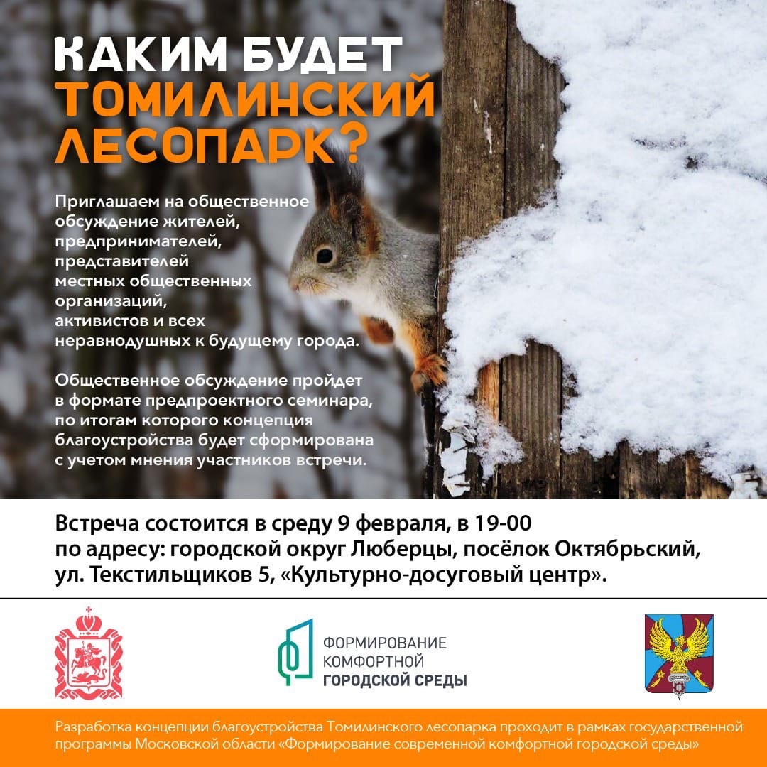 «Приглашаем на общественное обсуждение жителей городского округа Люберцы, предпринимателей, представителей местных общественных организаций, активистов и всех неравнодушных к будущему муниципалитета. Общественное обсуждение пройдёт в формате предпроектного семинара, по итогам которого концепция благоустройства Томилинского лесопарка будет сформирована с учетом мнения участников встречи», - отметил Власов.