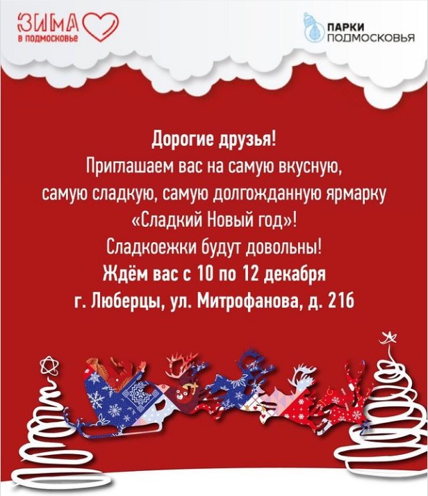 «С 10 по 12 декабря на главной площади парка «Наташинские пруды» городского округа Люберцы в рамках проекта губернатора Московской области Андрея Воробьева «Зима в Подмосковье» состоится долгожданная ярмарка «Сладкий Новый год!». Посетителей ждут пряные имбирные печенья, Тульские пряники, Покровская пастила, шоколад ручной работы, безалкогольный глинтвейн и грог и, конечно же, сладкие Новогодние подарки», - отметил Ружицкий.