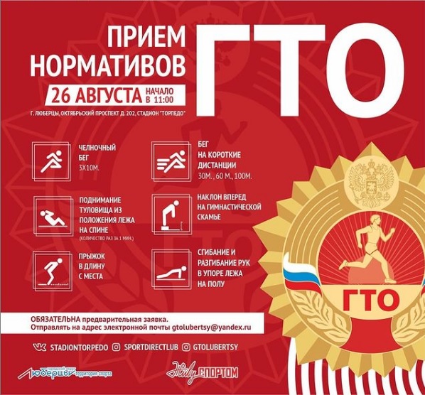 «В четверг, 26 августа, выполнить нормативы ГТО можно по следующим видам: бег на 30 м, 60 м, 100 м, челночный бег, сгибание и разгибание рук в упоре лежа на полу, наклон вперед из положения стоя на гимнастической скамье, подъем туловища из положения лежа на спине, прыжок в длину с места. Начало мероприятия в 11.00», - говорится в сообщении.