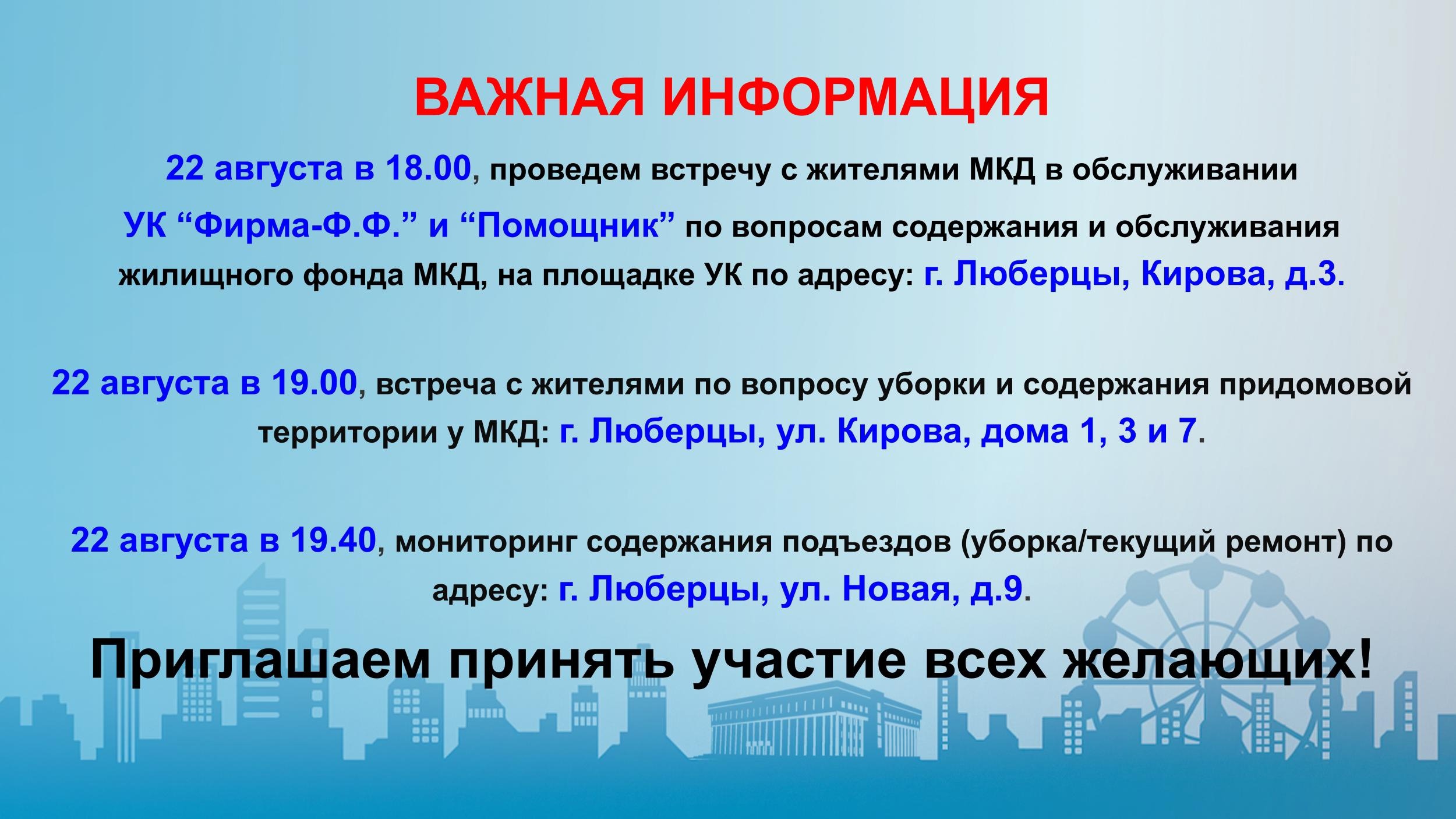 В 18.00 встреча состоится с жителями МКД, которые обслуживают УК «Фирма-Ф.Ф» и «Помощник». Тема разговора - содержание и обслуживание жилищного фонда МКД. Встреча состоится в офисе УК по адресу: Люберцы, улица Кирова, дом № 3.