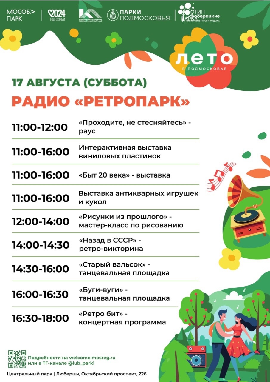 В субботу, 17 августа, для посетителей Центрального парка культуры и отдыха подготовили мероприятие «Радио «Ретропарк». Жители и гости Люберец смогут увидеть антикварные игрушки и куклы, послушать музыку на виниловых пластинках, познакомиться с бытом 20 века. Зажечь на танцевальных площадках и вспомнить любимые хиты 80-х и 90-х.
