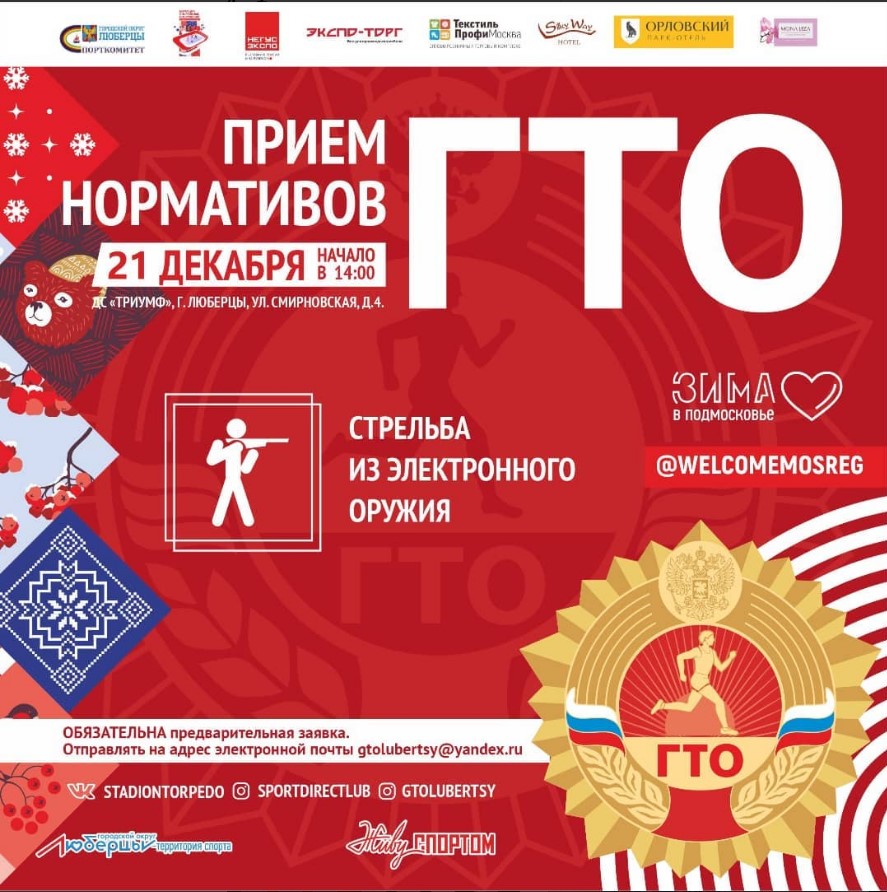 «21 декабря в 14.00 в ДС «Триумф» будет проходить прием нормативов ГТО по стрельбе из электронного оружия. Обязательна предварительная заявка. В заявке указать: ФИО, УИН, видя испытания и отправить на адрес электронной почты: gtolubertsy@yandex.ru. Всем участникам мероприятия иметь при себе медицинский допуск, защитную маску, спортивную форму», - отмечается в сообщении.