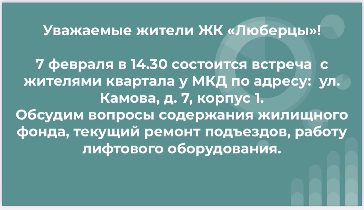 Жителей городского округа Люберцы пригласили на встречу, которая состоится 7 февраля в 14.30. Люберчане смогут обсудить вопросы содержания жилищного фонда, текущий ремонт подъездов и работу лифтового оборудования.