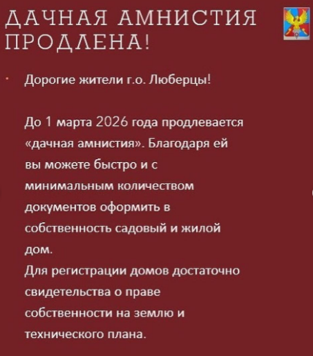 Дачную амнистию продлили до 1 марта 2026 года - в закон об упрощенном порядке регистрации прав на недвижимость внесли поправки и расширили его действие, сообщил заместитель председателя комитета по управлению имуществом администрации городского округа Люберцы Владислав Михеев.