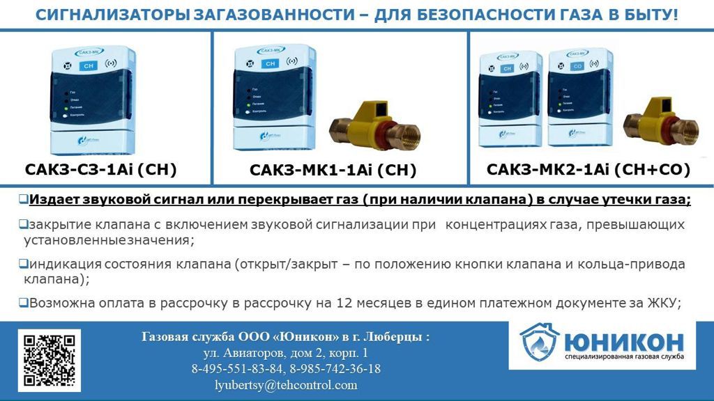 «Уважаемые жители городского округа Люберцы! Рекомендуем установить в жилых помещениях Системы контроля загазованности, которые обеспечивают непрерывный автоматизированный контроль концентрации горючих и токсичных газов в воздухе. При превышении предельных норм они оповещают об этом и блокируют подачу газа.