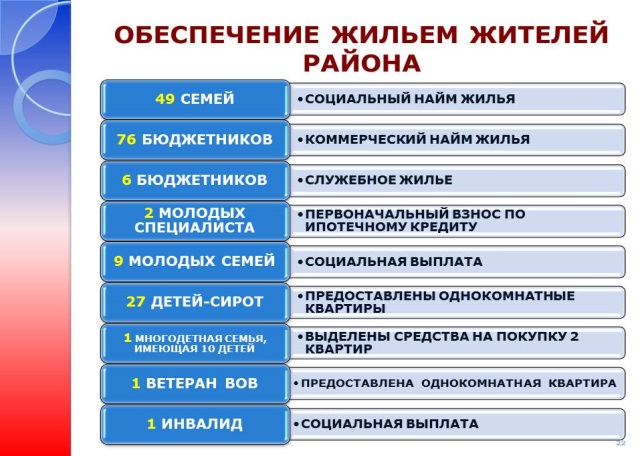 А ктивное жилищное строительство и различные виды финансовой помощи позволили в прошлом году улучшить жилищные условия 172 семьям из числа жителей города и района, среди которых учителя, медицинские работники, ветеран войны, молодые семьи. Из них 84 –работники бюджетной сферы.